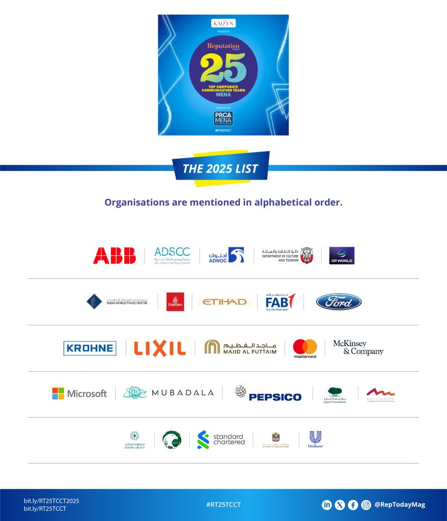 وقد تم إطلاق هذه القائمة السنوية المرموقة منذ 10 سنوات في الهند، والآن تطلق جائزة مخصصة لمنطقة الشرق الأوسط وشمال أفريقيا. تهدف الجائزة إلى تسليط الضوء على فرق الاتصالات الداخلية التي تظهر أداء استثنائيا في سرد القصص المؤسسية وإشراك أصحاب المصلحة والمواءمة الاستراتيجية وتأثير العلامة التجارية. تضم مجموعة 2025 علامات تجارية صناعية ومتعددة الجنسيات بارزة، بما في ذلك شركة ”إيه بي بي“ و”أدنوك“ وموانئ دبي العالمية وطيران الإمارات والاتحاد للطيران وماكنزي ومبادلة ومجموعة روشن، مما يبرز مدى اتساع نطاق ومستوى قيادة الاتصالات في المنطقة.