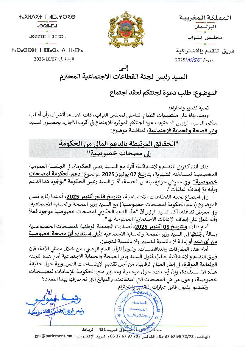 وكان الفريق أعاد طرح الموضوع خلال اجتماع لجنة القطاعات الاجتماعية بتاريخ فاتح أكتوبر 2025، بحضور وزير الصحة والحماية الاجتماعية، الذي أكد بدوره أن الدعم الحكومي للمصحات الخاصة موجود فعلا، وأنه عمل على إيقاف الإعانات الاستثمارية الممنوحة له وفق ماورد في سؤاله الكتابي